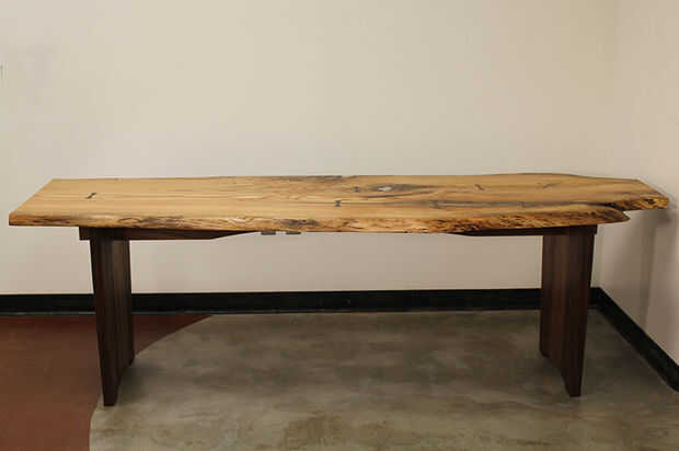 Se trata de una mesa de comedor que acaba de terminar para nuestra familia en el tiempo para las vacaciones. Está hecha de nogal y arce, que son mis favoritos tipos de madera para muebles. Las piernas son el nogal, la camilla es de arce y tapa de tab