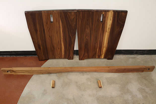 Puedes ver aquí la Asamblea. Las cuñas tienen todo junto con la tensión. La losa se sienta en la pierna y las espigas de pierna sentado en las ranuras de mortis en la parte inferior.