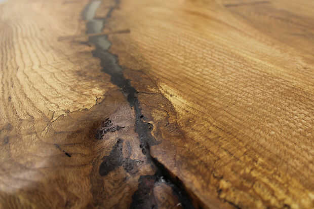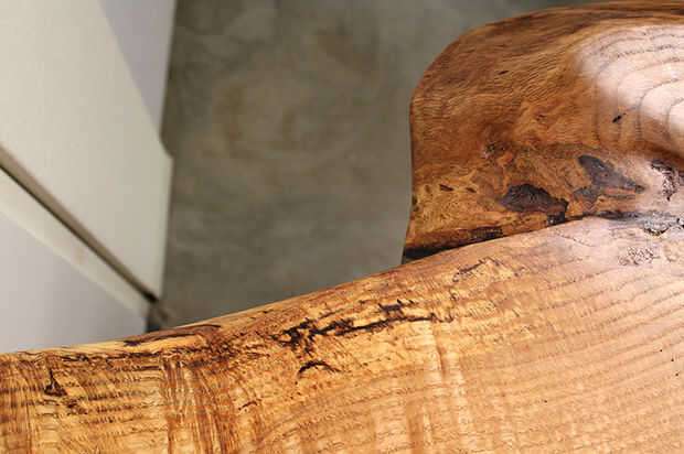 Tenemos suerte con esta losa y realmente las piezas de madera de nogal, así. Al llegar a madera áspera, no hay ninguna manera de decirle al grano y características como se ven cuando se hace. Conseguimos algunos burl y spalting en el roble. Y nos dieron algunas vetas cremosos agradables de albura en el nogal.