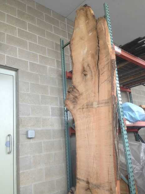 Nuestra losa pin oak fue 11 pies largo cuando llegamos y 3 pulgadas de espesor. Fue probablemente alrededor de 350 libras por estimación de bíceps. Eventualmente se cortará hasta unos 8 pies y 2 pulgadas de espesor.