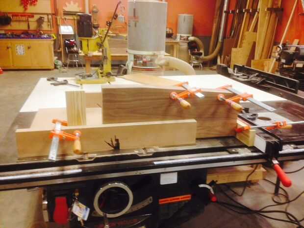 Las piernas fueron cortadas usando un dado sobre una sierra de mesa y el sistema de plantilla que se ve en la foto dos arriba. El sistema consta de dos paradas (una parada en el borde superior) y uno en la parte inferior y el trineo del crosscut. Hemos dado cortar las mitades de las piernas, los alineados y pegado una vez más. Mientras que tenía el dado en la sierra, cortar las espigas en la parte superior de las piernas para encajar en mortajas debajo de la mesa.