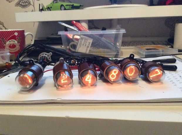 Cada tubo entonces fue conectado a un enchufe y los cables conectados a la placa de circuito. Ensayo y error se utilizó para asegurar que los tubos todos aparecen el dígito correcto en el momento adecuado. Afortunadamente hace más fácil con la secuencia de arranque de PVElectronics ciclismo a través de 0 a 9.