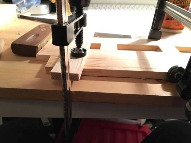 Usando Adobe Illustrator, reunir todos los elementos construidos y diseñados en un marco de pino para apoyar las hojas de acrílico. Me las arreglé para construir el marco entero de secciones de distinta longitud de 30 mm x 10 mm cepillada de pino.