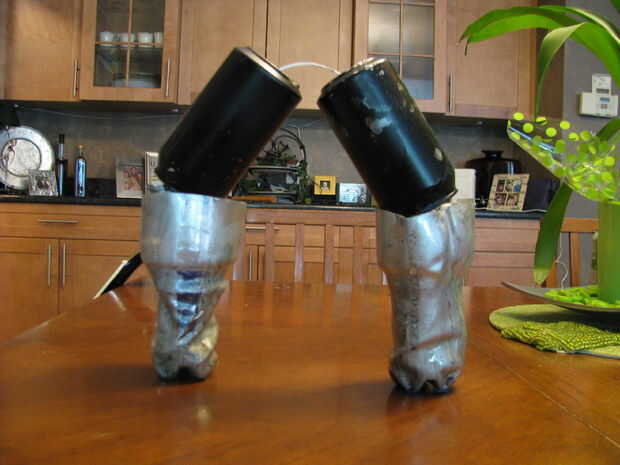 Primero, desentrañar una percha de alambre, enderezar las curvas y hacer aproximadamente un ángulo de 90 grados en medio del cable. Luego haga un orificio en la parte inferior de dos latas de refresco vacías y conectarlos mediante el cable así que cercano, justo al lado del ángulo en medio del cable. Después de esto, para proteger a las latas en su posición usted puede ravel un pedazo de cinta adhesiva debajo de la lata para que no deslice hacia abajo el alambre y se caen. Una vez que las latas son seguras, luego corte la pieza de forma de cono de la parte superior de dos 20 fl.oz. botellas. Luego los extremos del alambre de la bobina y coloque las bobinas de alambre dentro de las botellas de la corte. Finalmente para proporcionar estabilidad y proteger las bobinas de alambre, vierta la cera caliente en las botellas dejan enfriar y endurecer. Esto deformará ligeramente la botella debido a la calor pero añade efecto fresco.