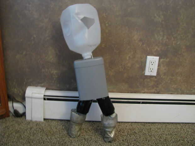 Para conectar el torso y la cabeza, primero necesita empujar dos agujeros en la parte superior del torso rectangular y corte el otro lado por lo que es como una caja abierta. Para conectar el torso a las piernas, usted necesita conectar la parte abierta del torso en la parte superior del ángulo de 90 grados y latas hechas para las piernas. Luego inserte un alambre enderezado hacia abajo a través de uno de los agujeros que hiciste en la parte superior del torso y con un poco más de la mitad de la izquierda del alambre, el alambre atar alrededor del ángulo de 90 grados un par de veces y extenderlo hacia arriba a través del otro agujero hecho en la parte superior del torso. Usted debe haber terminado con un torso a las piernas con unas pulgadas de alambre que se extiende hacia arriba a través de los orificios en la parte superior del torso, (este cable apoyará la cabeza). Con un cartón de leche, voltearlo boca abajo y asegúrese de que el mango se enfrenta directamente a usted. Luego haga dos orificios en la parte del cuello, (estilo Frankenstein) y extender los alambres hacia arriba a través del cuello. Después de que los cables se han apretado y en su lugar, para garantizar el robot completamente y evitar cualquier caída-offs, pegamento caliente la cabeza al torso.