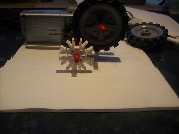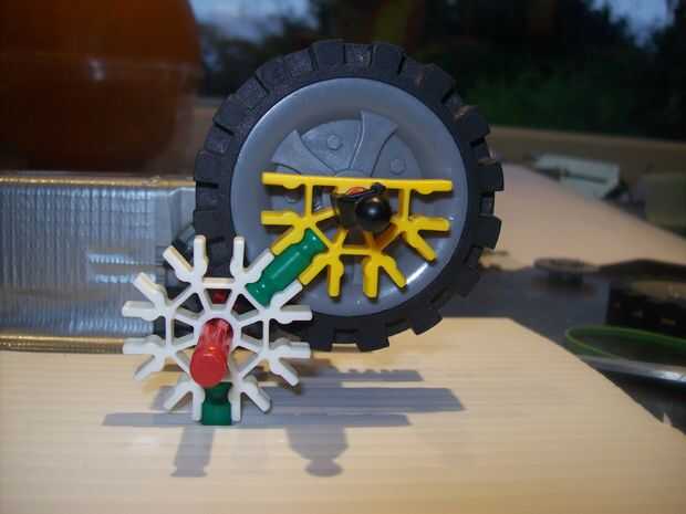 Por último poner un clip bola negra en el eje superior (uno con ruedas) y hacer un agujero en el plástico para que una barra verde puede ir a través de ella como se muestra en la imagen.