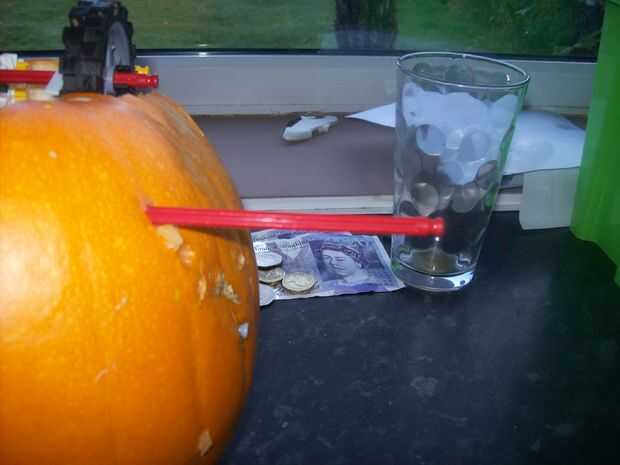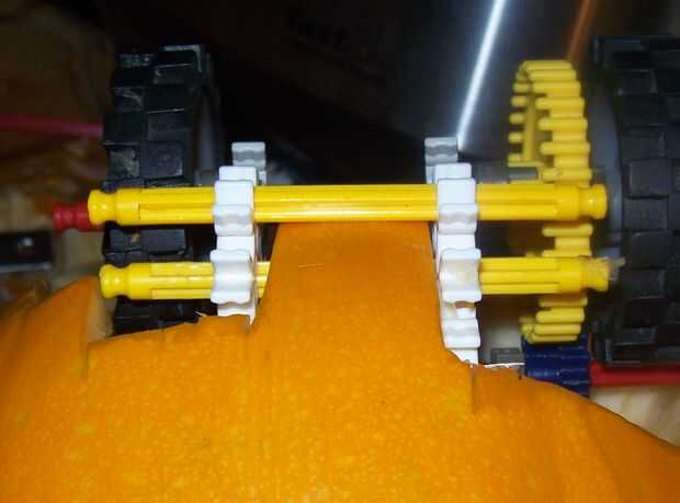 Con su palillo de la barra amarilla que a través del orificio marcado en cuadro dos y luego a través de la calabaza y el agujero en el otro lado.
