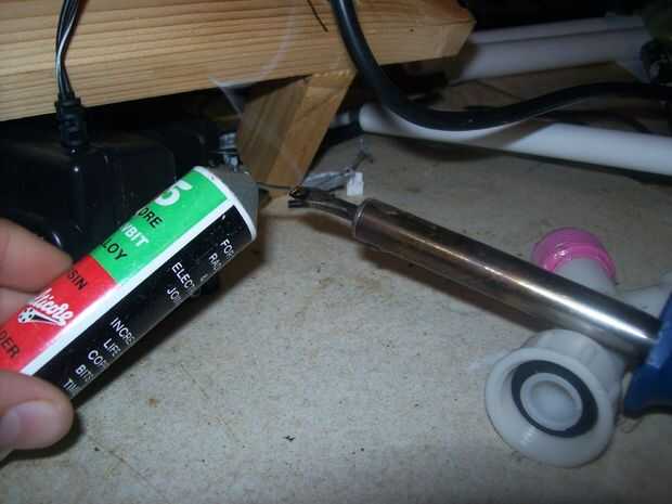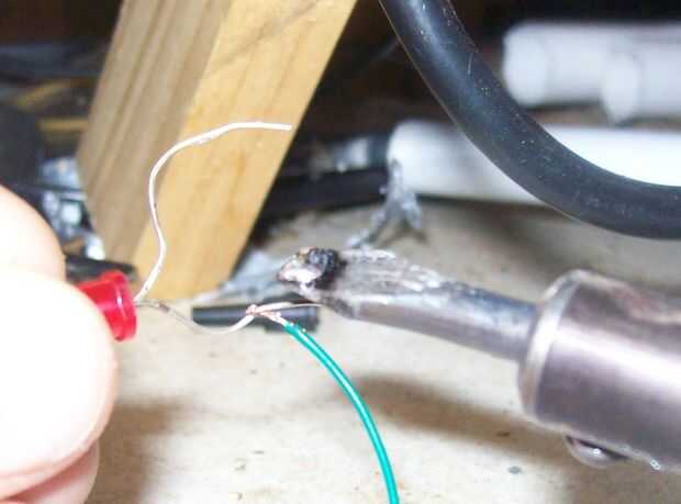 A continuación poner algunos de la soldadura de la punta del soldador coloquen la plancha y junto a la broca que desea soldar (LED al cable eléctrico) y fundir la soldadura sobre el cable y el LED con el hierro de la soldadura.