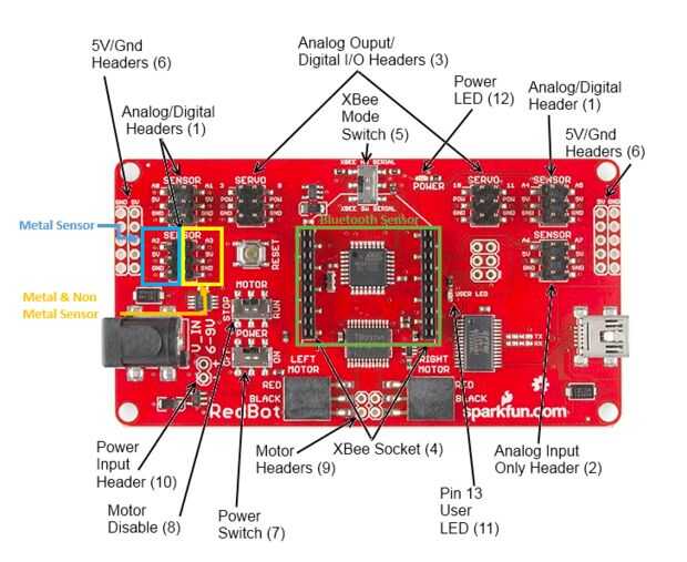 Cada sensor está montado en el RedBot Mainboard. Robo-cycler, utiliza puerto A2 para los sensores de Metal (azul) y A3 para el sensor de Metal y no Metal. El sensor de Bluetooth utiliza el puerto Serial de SW.