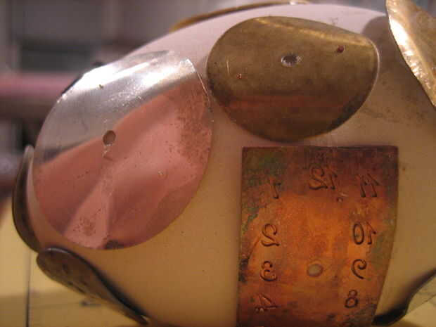 Utiliza alicates de punta redonda para doblar las caras de reloj. No preocuparse de ser exacta. Si el metal no ajusta exactamente la curva del huevo, va a ser bien. :)