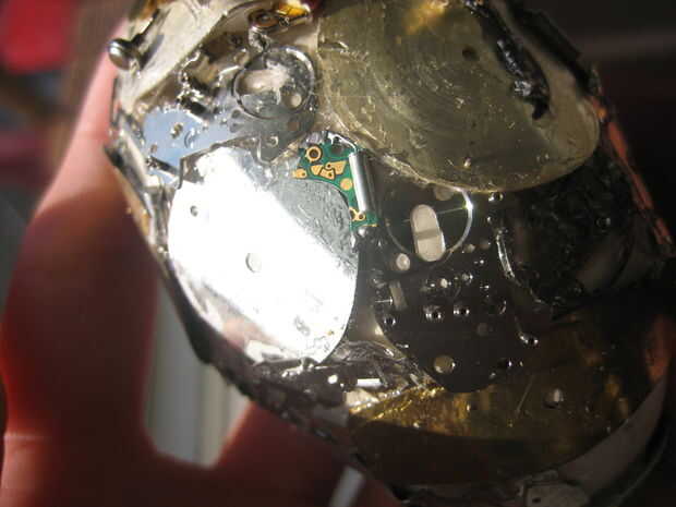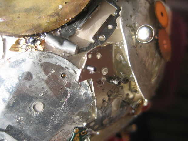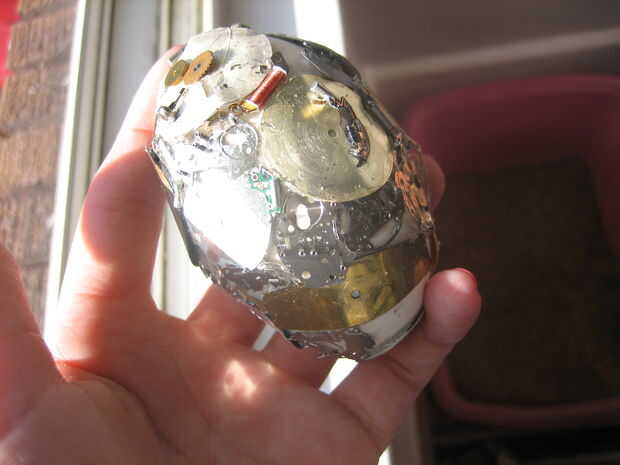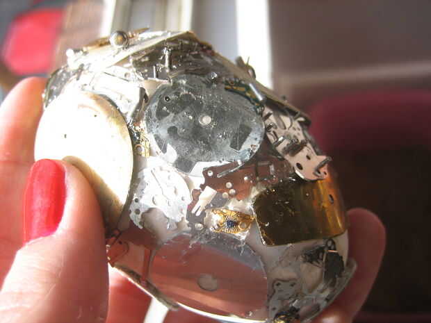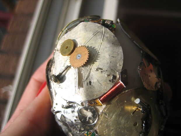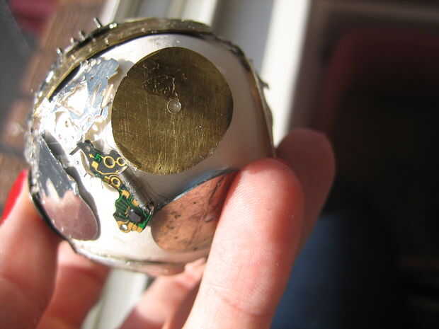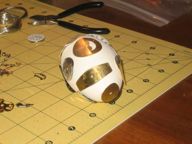 Entonces comencé a rellenar las áreas vacías con las tripas - circuitos, pedacitos de metal, etc.. Llené la segunda noche en aproximadamente la mitad del huevo. La tercera noche terminé de rellenar.