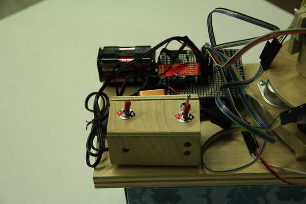 Esto es donde pongo todos los interruptores para el control remoto. Tuve 2 interruptores de fuente de alimentación y un interruptor para mi imán electo montado aquí. Me aseguré que mi interruptor de imán electo no estaba cerca de los otros dos interruptores para evitar el accidente de apagar los interruptores de fuente de alimentación. Básicamente concluye la construcción mecánica del brazo ficticio.