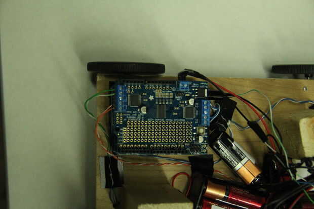 Una vez terminado el escudo lo es hora de ponerlo a utilizar. Perforé en unos agujeros en el frente y la parte posterior del chasis para llevar los cables de los motores al escudo. Yo entonces enganché mis motores, cada uno a un puerto de los bloques de terminales utilizando un alambre tenía por ahí. (Lo siento no tengo el calibre del alambre que utiliza.) Una vez que los motores fueron enganchados, conectado la batería utilizando un complemento de la batería de 9v. Una vez listo el cableado, he enchufado mi Arduino en mi ordenador y había subido un bosquejo de ejemplo ligeramente modificada que vino con el escudo de v2. Me modificó para motores de 4 y ajustar el modelo del bucle automatizado para probar la clase de movimiento. (Remite: todos los motores impulsando. Al revés: Todos los motores de conducción hacia atrás. Vuelta/girar a la derecha: lado derecho motores mueven hacia atrás como los motores del lado izquierdo seguir adelante. Turn/Rotate a la izquierda: izquierda motores retroceder como motores de derecha avanzar.)