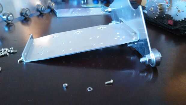 9. Fije la placa base superior al resto del marco con 4 pequeños tornillos, arandelas y tuercas como se muestra.