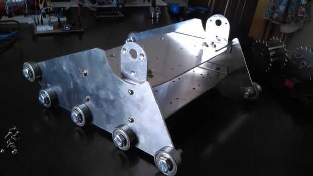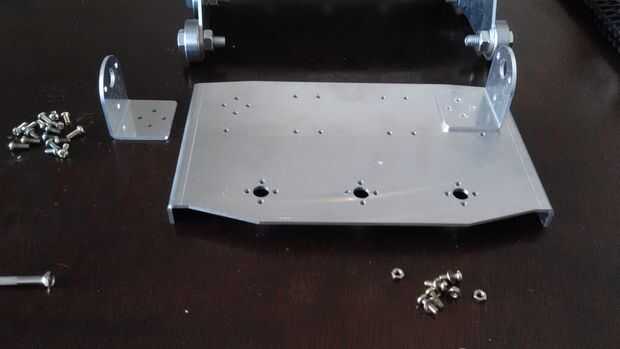 1. Tome las piezas 2 laterales con rodamientos acoplados, la placa base inferior, 4 pequeños tornillos, arandelas y tuercas.