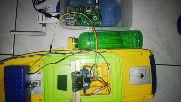 Conecte el cable de puente desde el L298n para los GPIO frambuesa Pi. Colocar el plástico encima de cuerpo del barco. Asegúrese de que todos los componente y módulo están sellados en la caja y la no hay agua la caja excepto cámara USB.