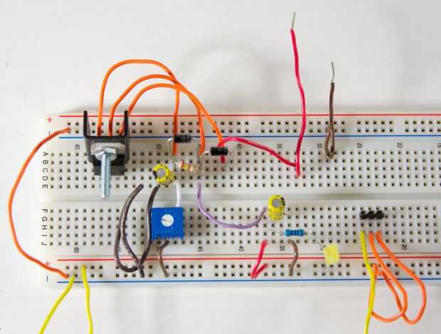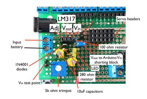 La parte importante para el regulador de tensión LM317 es ajustar el trimpot de k 5 para que la tensión de salida es 5V. El LED puede utilizarse como un indicador visual de la tensión. Si el LED es extremadamente brillante o quema, entonces usted puede haber demasiado voltaje de salida y sus servos puede estar en riesgo.