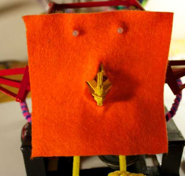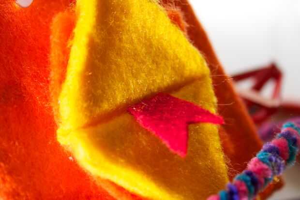 Comienza cortando un pequeño 'plus' en el centro del diamante. Colocar el fieltro en la cara de RoboBrrd y ver cuánto más tiempo los lados plus tienen que ser. El pico se debe meter a través de la plus un poco. Por repetir este proceso hasta que el pico entero puede aparecer a través de, y el fieltro quede al ras con la parte frontal. Ahora puede pegar el fieltro en la parte delantera en todos los bordes.