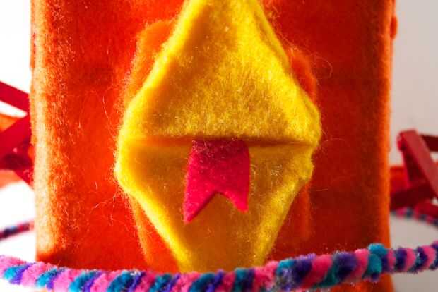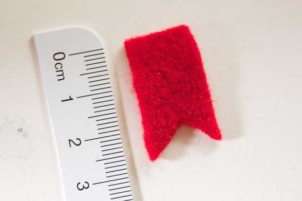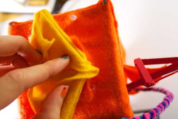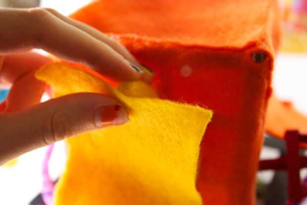 A partir de ahí, tienes que bajar el fieltro hacia la punta del pico inferior. Debe existir cierta holgura extra en el medio creando un bulto. La protuberancia debe ser sobre un poco menos de un centímetro de altura. Pegar la parte inferior central de la pieza a la punta del pico inferior medio.