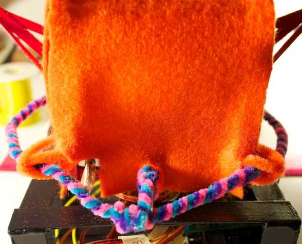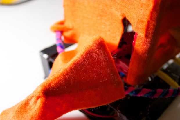 Presionando el fieltro a través del puente de la nariz y a los lados del pico, puede crear una forma suave agradable. Usted querrá asegurarse de que algunos de los de fieltro es fijar a los bordes del pico, que puede estar escondido detrás de la cara frontal, en el interior de la RoboBrrd.