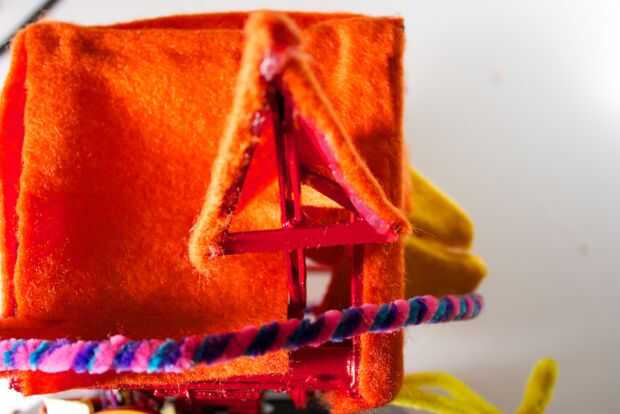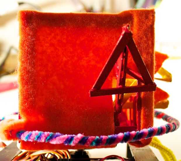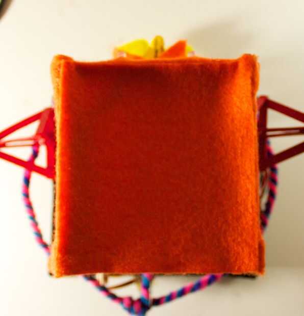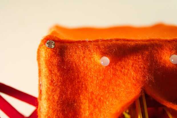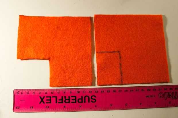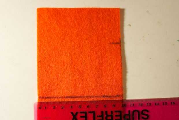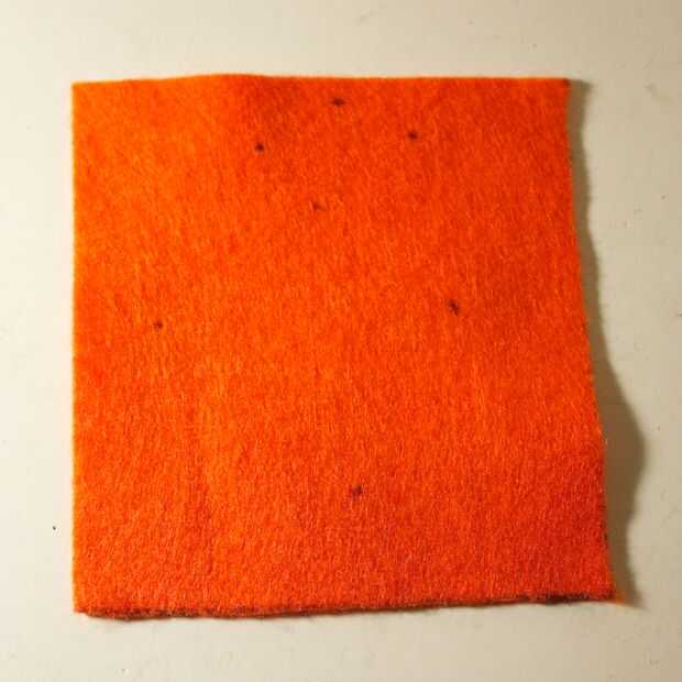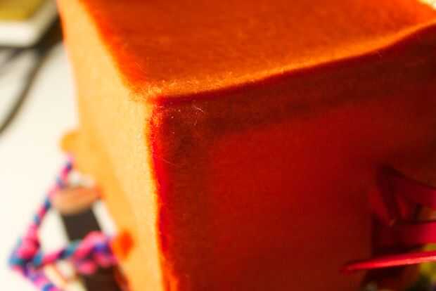 Para la parte delantera, tienes que comenzar con un trozo de fieltro que es un par de cm más grande que el tamaño de la cara frontal (10cm). A partir de ahí, se asoman unos agujeros por donde aparecerán los LEDs a través de. Al hacerlo, usted querrá asegurarse de que el borde superior (con algún exceso de fieltro en él) lo restante recto, paralelo con el borde superior de la cara frontal.