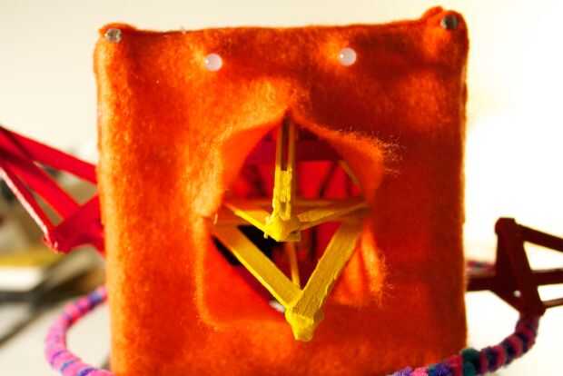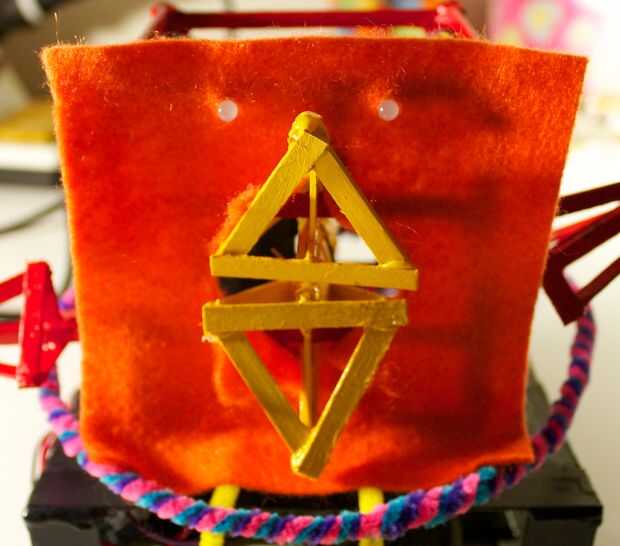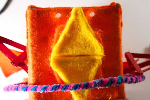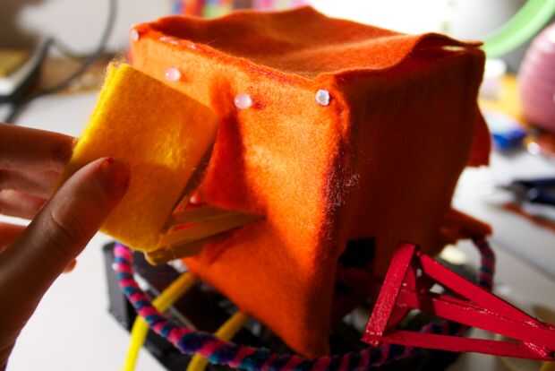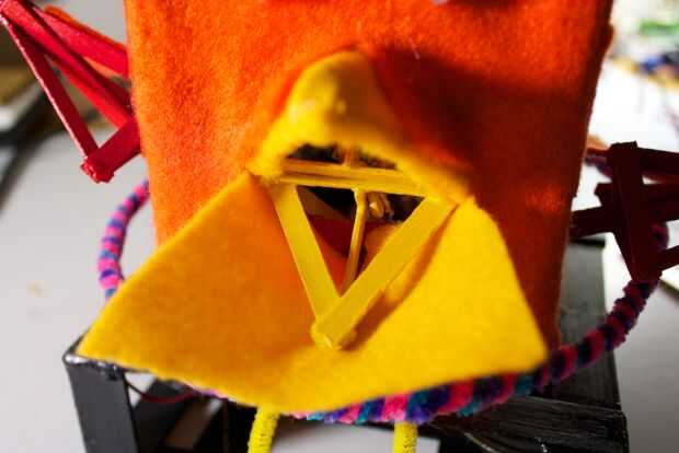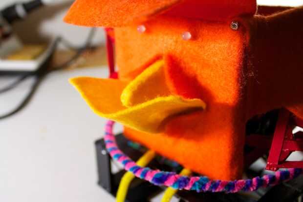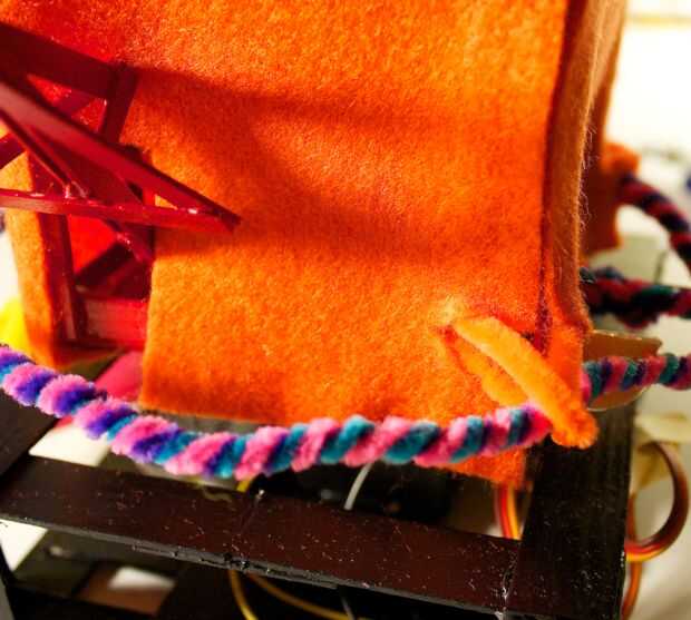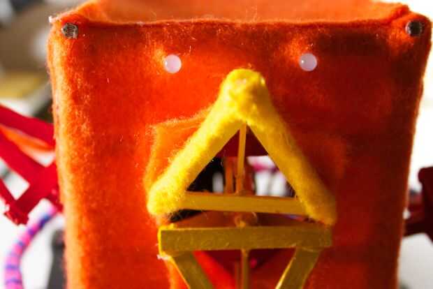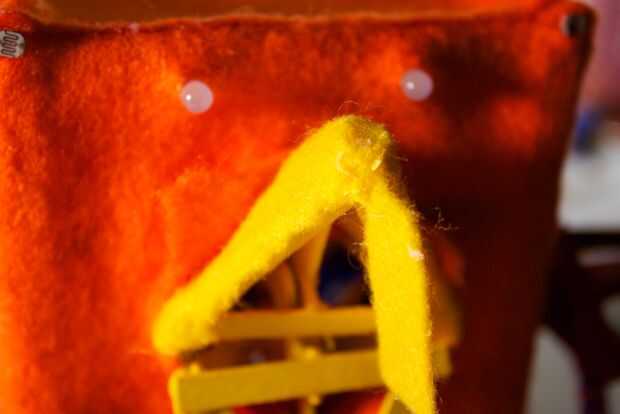 Ahora, tenemos a la medida y estimación donde nos debemos cortar para el pico de la apertura. La mejor manera de hacerlo es manteniendo el fieltro en la parte frontal, y marcando desde el interior de la RoboBrrd. Queremos marcar donde los bordes del pico, creando una forma de diamante.