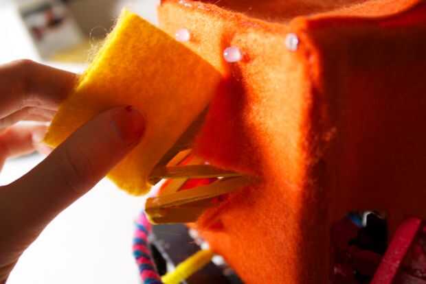 Ahora, pulsa el topetón de fieltro sobrante a través de la abertura entre las dos mitades del dos pico. Esto se utiliza para crear una sensación perfecta entre las dos mitades del dos pico. Asegúrese de que el fieltro está sentando a ras con el interior del pico. Cuando está, agregue el pegamento en el interior los bordes del pico y prensa el fieltro en él. Cortar todo el fieltro sobrante, y se hace!