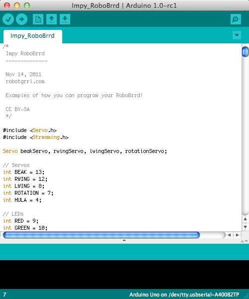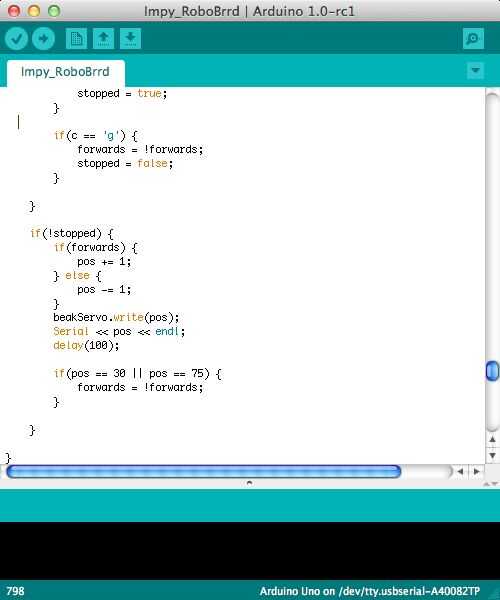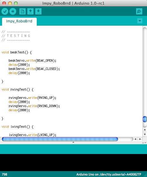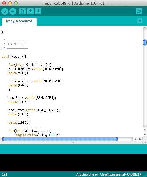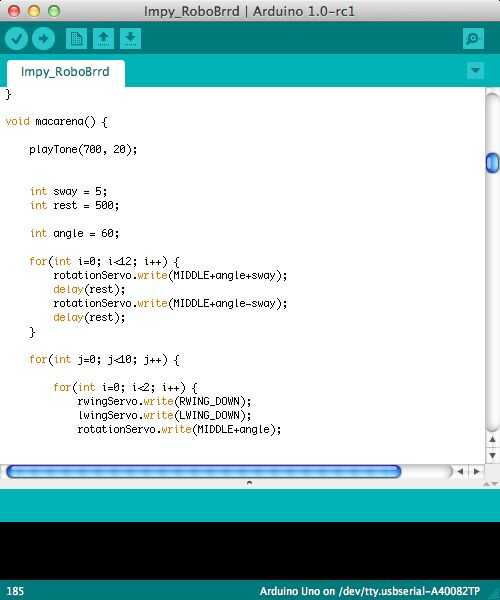 Las danzas de RoboBrrd consisten en generalmente un montón de movimientos de rotación del servo, así como el ala de aleteo.