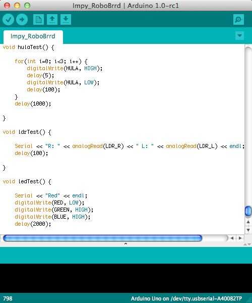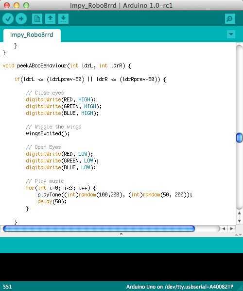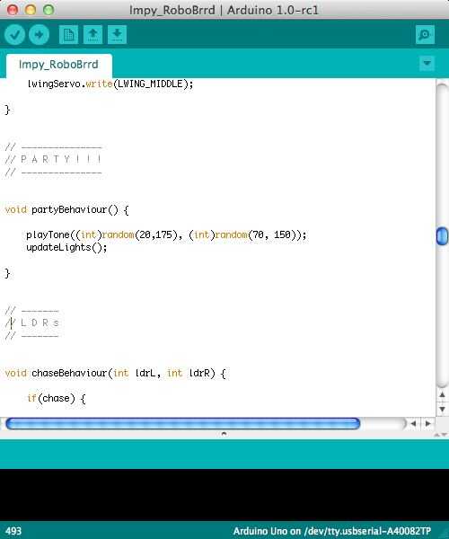 Los comportamientos de lo RoboBrrd sólo están limitados por su imaginación. Puesto que hay dos LDRs en RoboBrrd, podemos crear un simple photovore 'persiguiendo a luz' (u ocultar) comportamiento que es muy divertido.