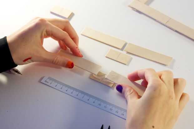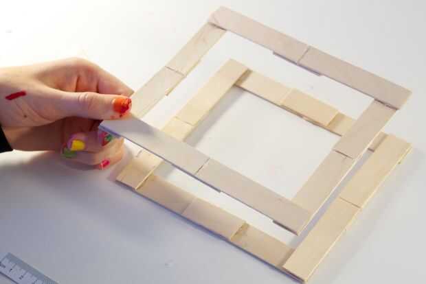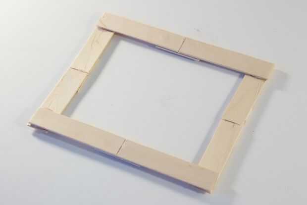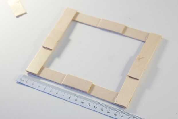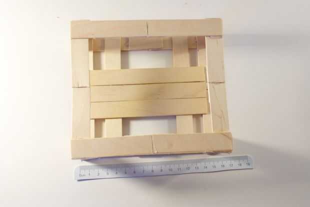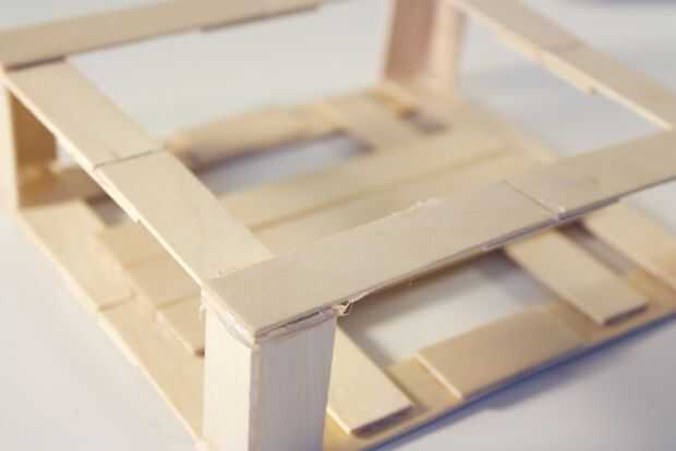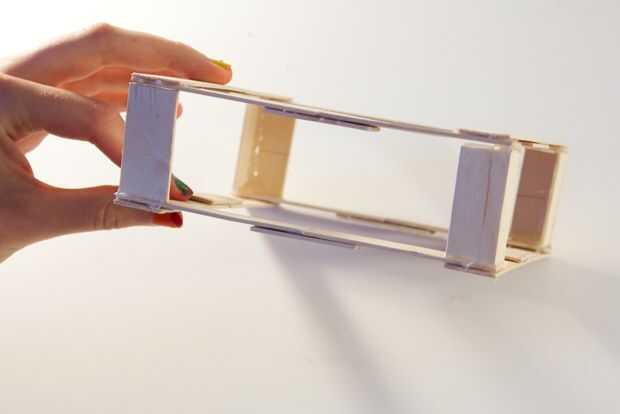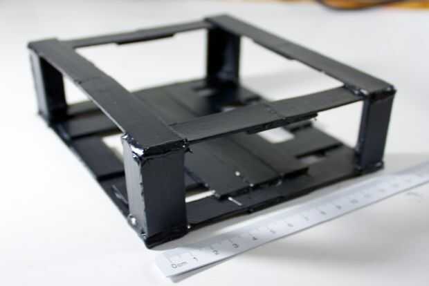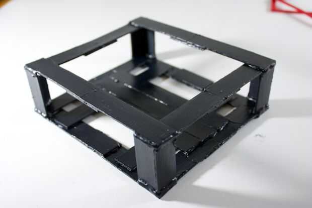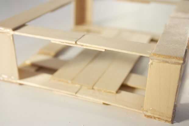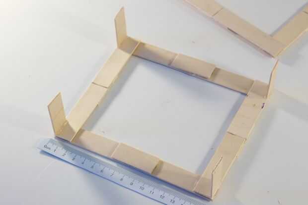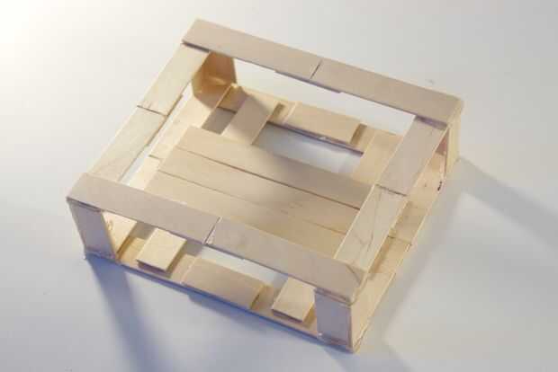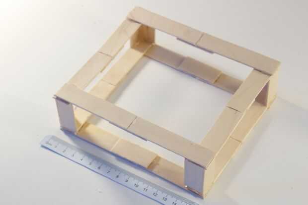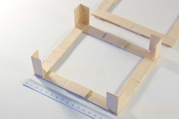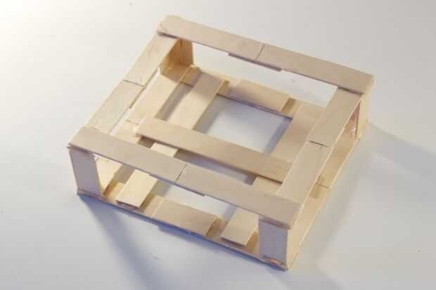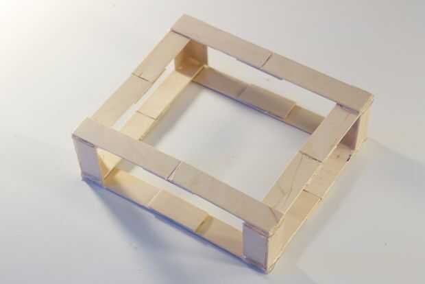 La forma más fácil de construir la base es hacer primero la parte inferior y superior pedazos 'planas'. Luego, fije los soportes perpendiculares a la parte inferior. Para terminar, pega la pieza superior en los soportes.