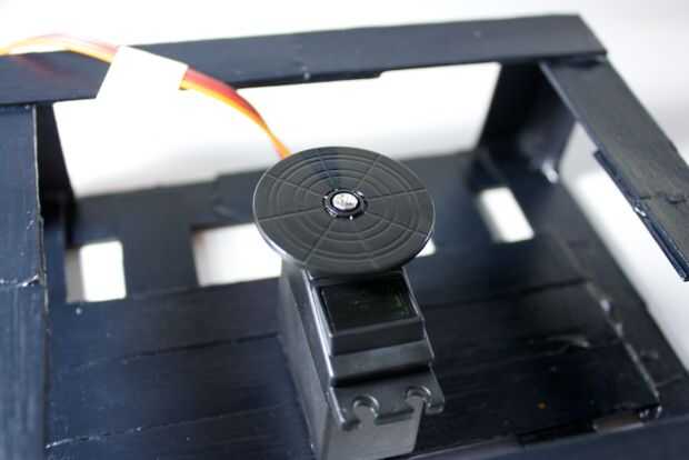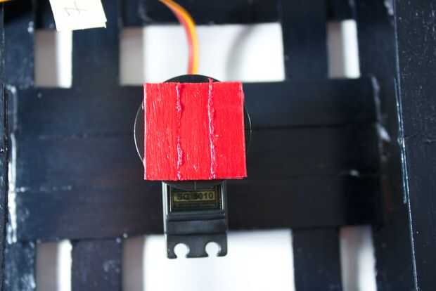 Vamos a utilizar el cuerno del servo circular en el servo de rotación ya que tiene la superficie más grande. Encima aquí, tenemos una pequeña construcción de palo de paleta. Antes de la construcción para el cuerno del servo, asegúrese de que el tornillo está en el cuerno del servo.