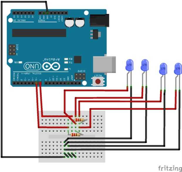 Luego le agregamos los LED en el pin 6, 7, 8, 9, 11 y 12. voy poner un lío todo de cables en el protoboard, así que asegúrese de que usted no se debe confundir cualquiera de ellos (ayuda a los cables del color-código). Primero hizo algunas filas en la protoboard para poner los LEDs en y había hecho algunas filas que conecte a la tierra. Entonces agregué 2 LEDs por fila con el puente de la M/F los cables y conectar los otros extremos a la tierra. Básicamente hice 3 sets idénticos de LEDs en mi protoboard, lo que puede configurar uno de ellos puede verse en la imagen con sólo los LEDs.