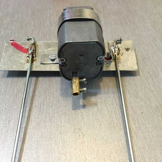Dos radios de bicicleta en base de la soldadura, la distancia entre rayos debe ser 8.5 cm. El eje rotatorio del motorreductor debe ser aproximadamente de 8 mm sobre la base.