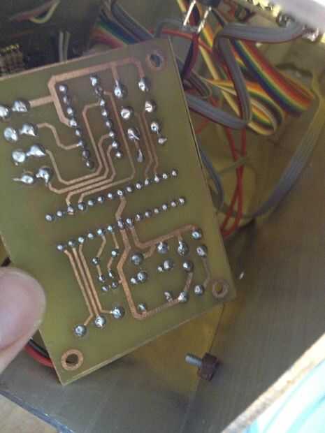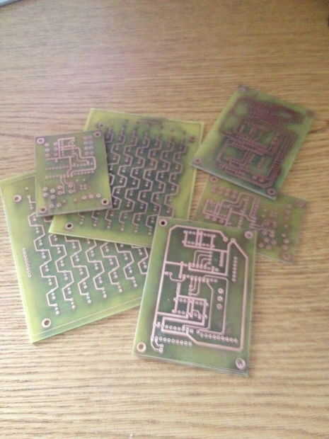 Las tablas para este proyecto fueron creadas en Fritzing. Es maravilloso software gratuito para principiantes. Encontrará los archivos de Fritzing para cada una de las tres juntas en 'RoboDolly_files/electrónica'. Con estos archivos, se pueden generar representaciones vectoriales (para grabado) y archivos gerber (para fresado automatizado). He incluido los archivos PDF que he utilizado para grabar cada uno de mis propios tableros. Debe ser impreso en tamaño real, y su tamaño debe ser verificado antes de grabado. Hay varios tutoriales en grabado de placas de circuito impreso en Instructables, así que escatimaré una explicación completa.