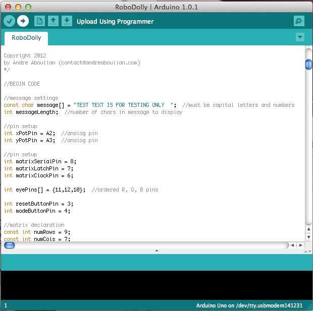 El software para usar el Arduino puede encontrarse en el sitio web. Después de instalar esta aplicación, abra el archivo 'RoboDolly.ino' y editar el inicio de la línea con "const char mensaje [] =". Introduzca el mensaje deseado entre un par de comillas dobles. El mensaje sólo puede contener letras y números; se ignorarán todos los caracteres. No hacer ningún cambio cualquier números de pin, ya que todos los pernos en el programa corresponden a aquellos en el microcontrolador PCB. Añadir el código para el Arduino y transferir la IC a la placa del microcontrolador.