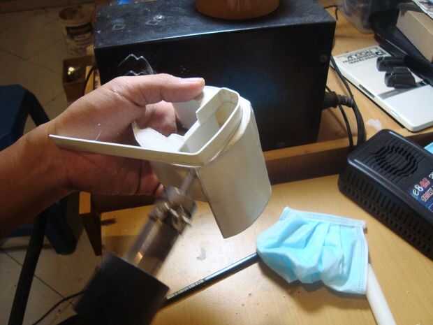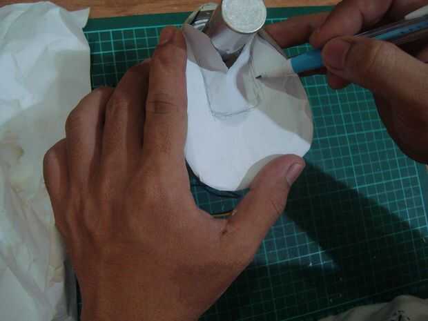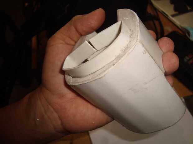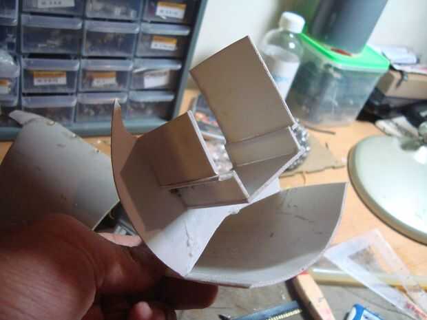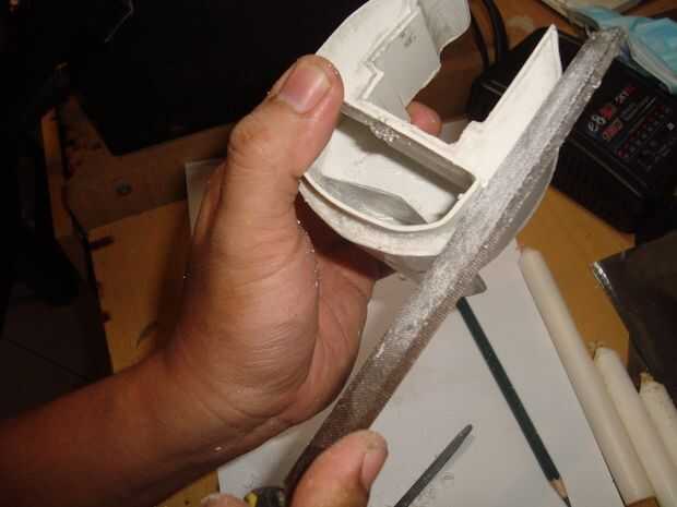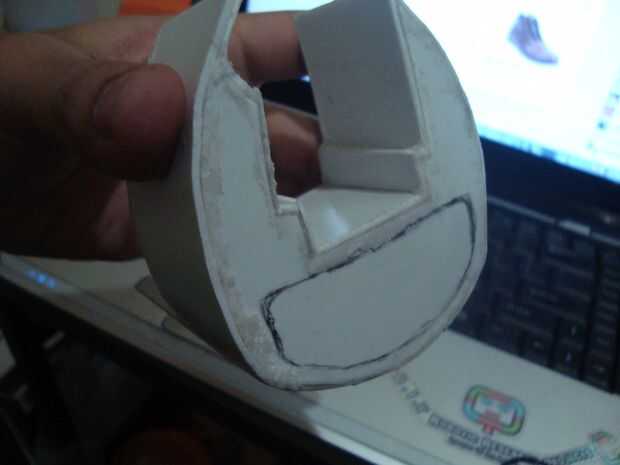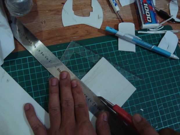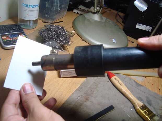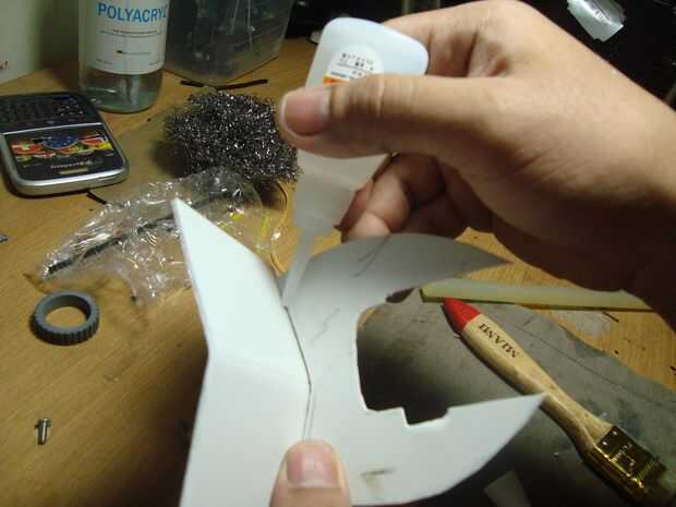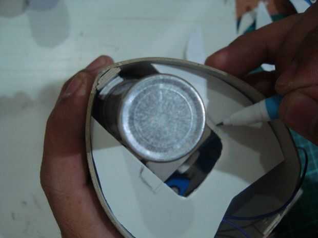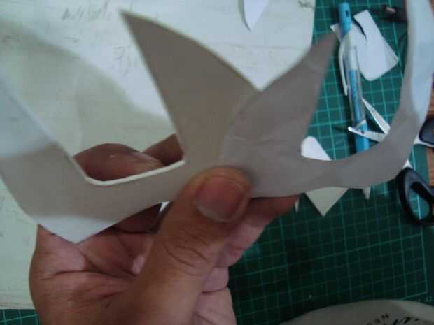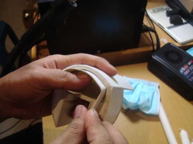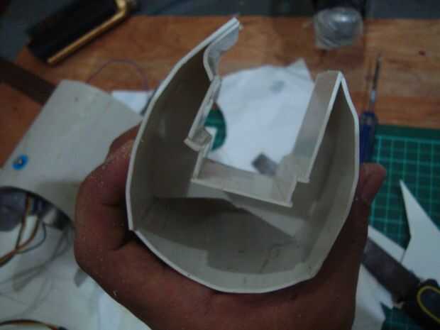 utilizar el papel para hacer un patrón, el patrón en mayo en un piso de goma pvc y corte. Corte el pvc plato aproximadamente 7 cm x 5 cm. doble pvc para formar degre alrededor de 100, a la forma utilice los sopladores calientes, como se muestra en la imagen. Pegar el patrón primero use pegamento super fuerte pic.12. seguir el proceso en el paso siguiente paso en las imágenes con el mismo método en el proceso de arranque, para que el cuadro formado con formas que entra en el cuerpo de los peces robot.
