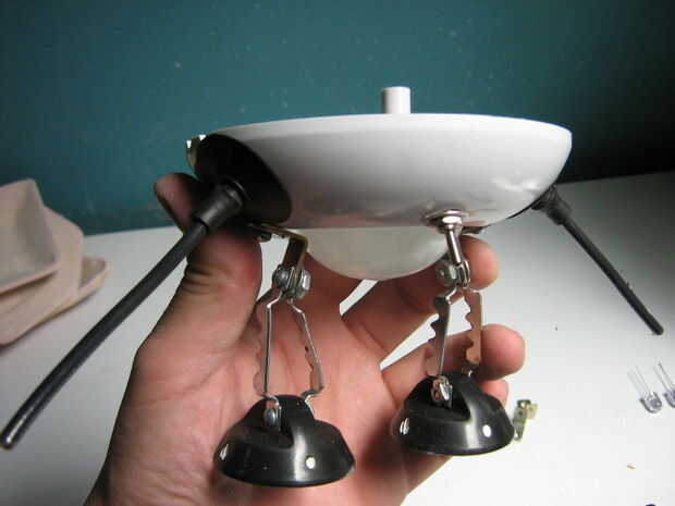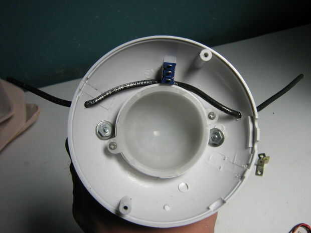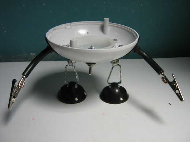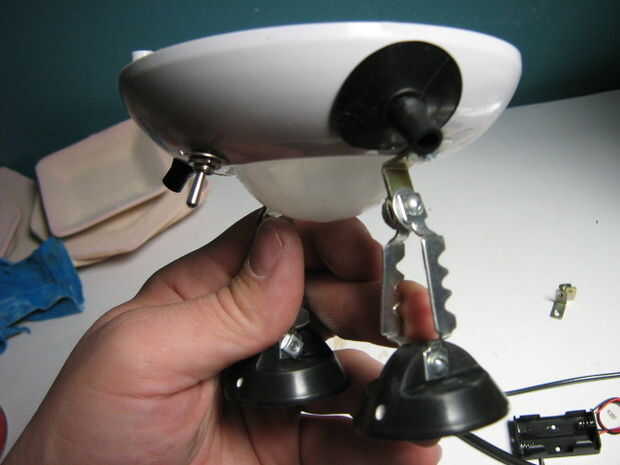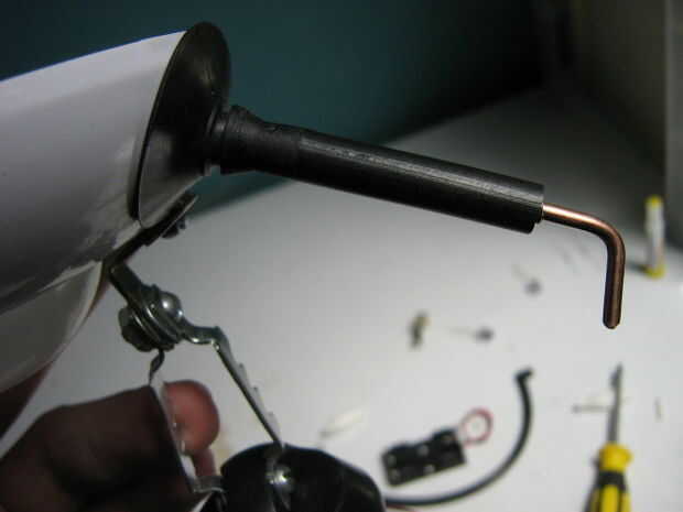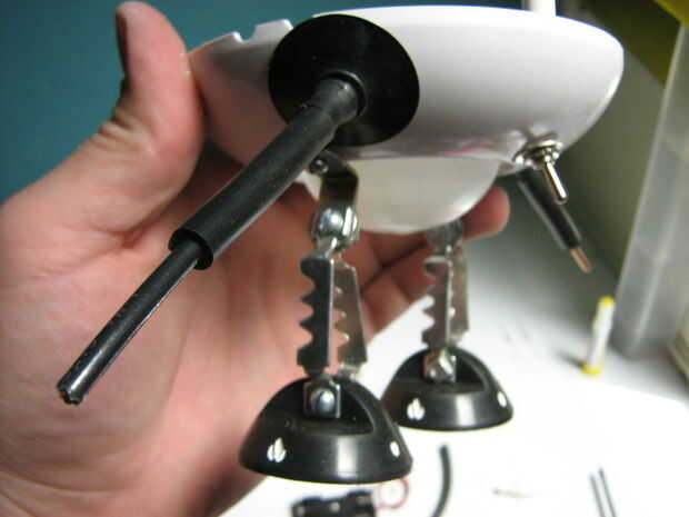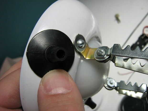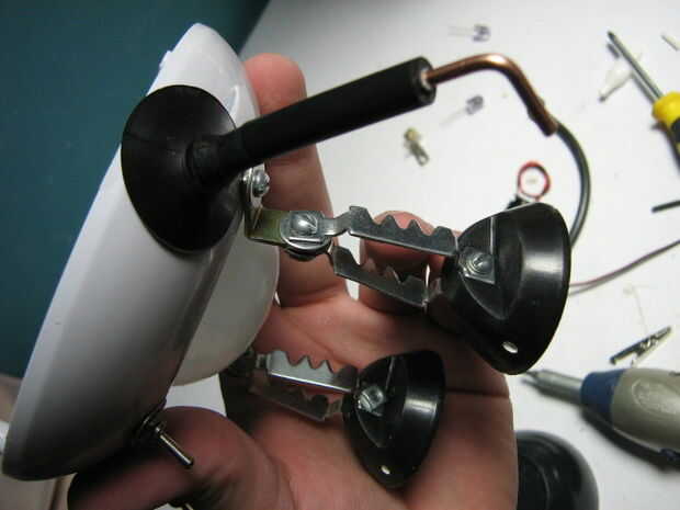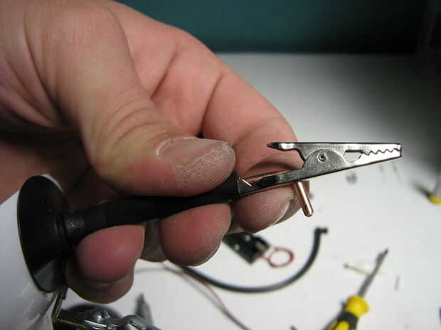 Now, the arms. Taladre dos agujeros, uno en cada lado del cuerpo. Si lo desea, utilice las rejillas de ventilación como referencia y taladre. Introducir el alambre de cobre en un lado y saque para el otro. Cadena de las rejillas de ventilación en cada lado y más tarde, el tubo de goma. Quitar el cobering plástico del alambre, doble e inserte los cocodrilos.
