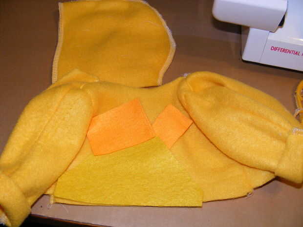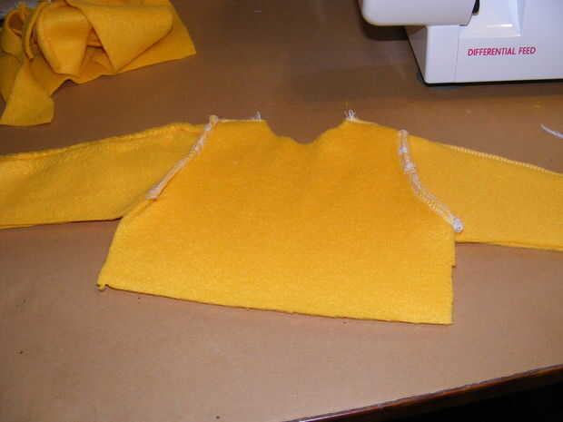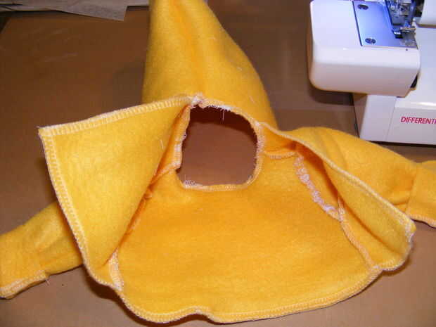 Cortar un trozo de tela lo suficientemente grande como para cubrir la cabeza de la muñeca para hacer la capucha. Dóblalo por la mitad a serge un cuarto círculo como costura. Serge el borde delantero para darle un aspecto acabado.