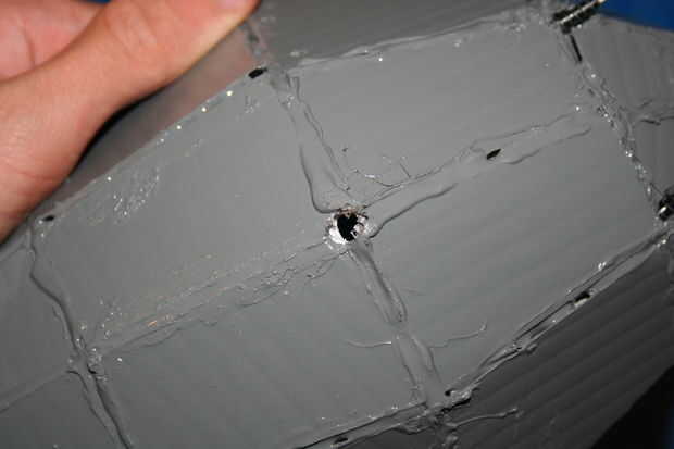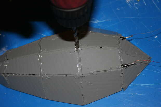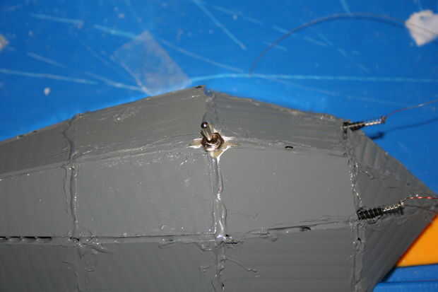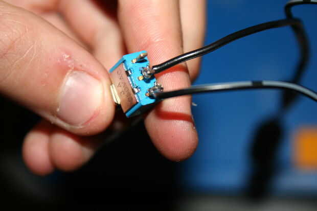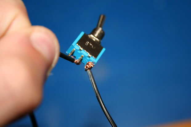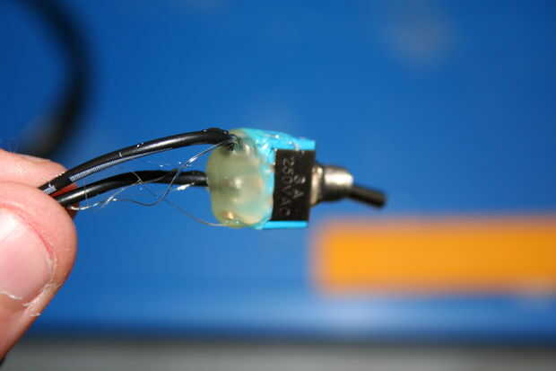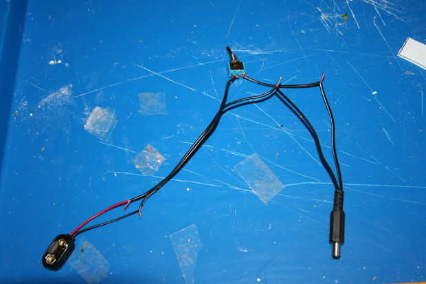 Comienzo cortando dos 9" piezas de alambre y corte de en medio. Luego de la soldadura del alambre largo con el cable positivo en el cierre de la batería de 9 voltios y uno de los cortos cables al cable negativo. A continuación, suelde el otro extremo del cable corto a la mitad terminal el interruptor basculante y suelda el otro cable corto a uno de los terminales exteriores del interruptor. Después de eso, cubra los terminales del interruptor con el adhesivo caliente. Luego soldar el cable que viene desde el lado positivo de la batería rápido al terminal del centro de la toma de barril y soldar el cable que viene del interruptor al terminal exterior de la entrada del cañón. Luego, Enrolle cinta aislante alrededor de todas las conexiones. Finalmente, perfore un 1\4 "agujero en el punto más alto e instalar el interruptor en él.