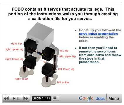 Tiempo para calibrar los servos de FOBO.  Esto es necesario porque es imposible que todo el mundo montar los servos en exactamente la misma orientación.  Así describe la calibración compensa el servo único para un específico FOBO.  Esto permite que cada FOBO utilizar acciones creados por alguien más. Usted puede acceder a la presentación con instrucciones animadas aquí (la imagen es una captura de pantalla de la presentación).