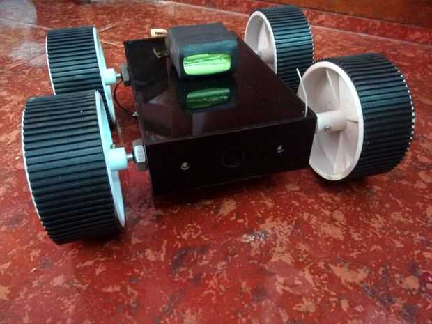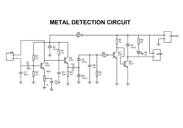 El circuito detector de metales es soldado con los componentes disponibles en el circuito de hobby y alimentado con la batería de 9V y comprobado. Este circuito se coloca dentro del chasis junto con el circuito del receptor de RF y la cámara que independientemente funciona con otra batería de 9V. El circuito receptor de la consta de la IC Atmega y el conductor del motor IC para controlar el movimiento del robot. El circuito detector de metales tiene un timbre que suena cuando el robot detecta un metal. El rango de sensibilidad de nuestro detector de metales es 1 pulgada.