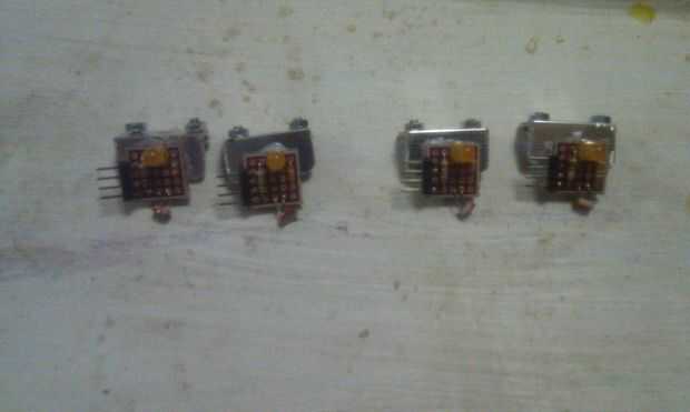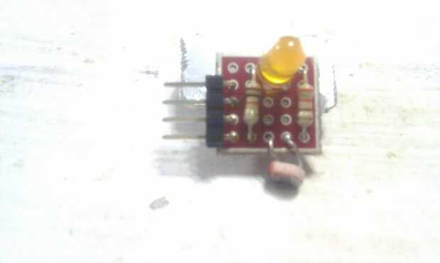 Entonces compré 4 protoboards - http://www.sparkfun.com/products/8886 , 4 X naranja LEDs, resistencias 4 X 330 ohmios, resistores de 4 X 10 K ohmios y 4 X dependiente de la luz resistencias y algunas salidas de pin header para hacer un 4 tableros que tienen un combo de LED y un sensor de luz. Originalmente usé cinta de doble cara para montar en mis soportes, pero mantuvo caerse así que decidí usar silicona para pegar en. Pegamento caliente realmente podría haber sido una mejor opción, pero no tengo ninguna.