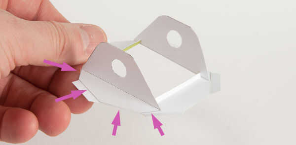 Pierna de pegamento las dos ayudas a la base del cuerpo para que estén alineadas con el borde del agujero y con los bordes de la base del cuerpo. Observe que las dos lengüetas que atraviesa el orificio de la base se doblan para arriba en 90 grados. Estos añadir rigidez a la base.