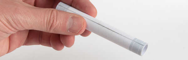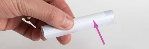 Rollo del hombro de tubo redondo para que el borde se alinee con línea gris con flecha en la imagen superior. Pegue el tubo asegurándose que el borde está exactamente alineado con la línea gris a lo largo de toda su longitud.
