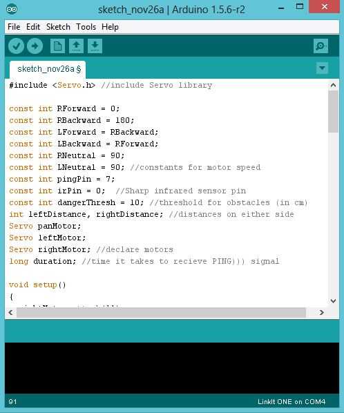void loop() {int distanceFwd = be; si (distanceFwd > dangerThresh) //if camino está claro {leftMotor.write(LForward); rightMotor.write(RForward); //move adelante} else //if camino es bloqueado {leftMotor.write(LNeutral); rightMotor.write(RNeutral); panMotor.write(0); delay(500); rightDistance = be //scan a la derecha delay(500); panMotor.write(180); delay(700); leftDistance = be //scan a la izquierda delay(500); panMotor.write(90); //return al centro delay(100); compareDistance();}} void compareDistance() {si (leftDistance > rightDistance) //if queda menos obstruido {leftMotor.write(LBackward); rightMotor.write(RForward); //turn delay(500) izquierdo;} más Si (rightDistance > leftDistance) //if derecho es menos obstruido {leftMotor.write(LForward); rightMotor.write(RBackward); //turn delay(500) derecha;} else //if son igualmente obstruido {leftMotor.write(LForward); rightMotor.write(RBackward); //turn 180 grados delay(1000);}}