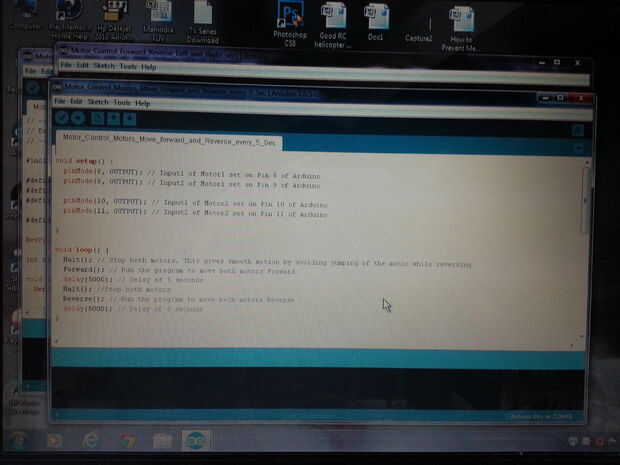 El programa - es un programa sencillo que permite al bot a avanzar durante 3 segundos, detener entonces mover hacia atrás por 3 segundos, girar a la derecha durante 3 segundos y luego a la izquierda durante 3 segundos. Desarrollé este programa después de 15 horas de i+d. La gran ventaja de este programa es que todos mis subrutinas para moverse adelante, atrás, giro, parada, etc. están listos que me ayudaría enormemente en los próximos modelos.