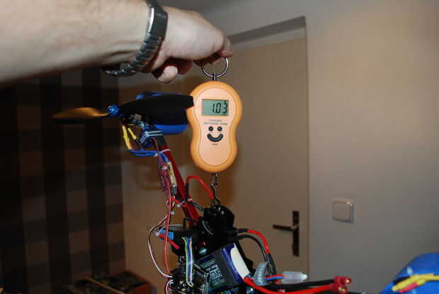 Y tienes muy simple y potente tricopter, pesa alrededor de 1, 03kg. En este paso se puede realizar prueba de marco con el tablero de kk.