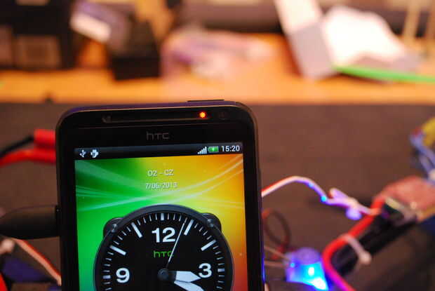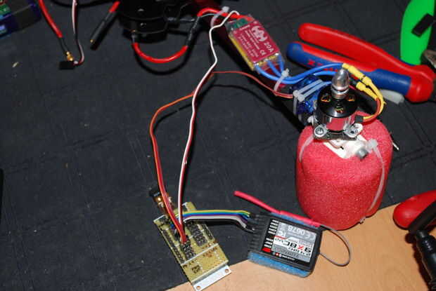 Para prueba propone utilizamos sólo receptor conectado a digitales hoyos 3, 4, 5, 6, 7, una ESC con ubec (conectado al pin10) y un servo (conectado al pin 11). Usted puede ver bluetooth dongle conectado al puerto USB de android ioio, usar bluetooth para depuración simple. Su teléfono puede todavía conectado a la PC via USB y puede comunicarse con ioio sobre el bluetooth. Es mejor usar cable de conexión entre ioio y el teléfono durante vuelos y pruebas a bordo (esperemos) :)
