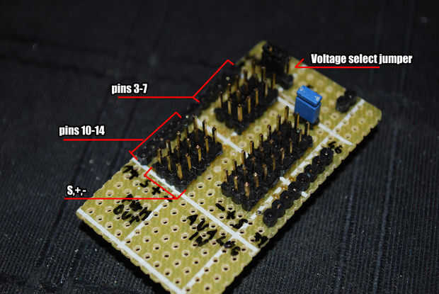 Puede utilizar escudo simple para IOIO (véase fotos), que romper los pines PWM. Hacer el PCB universal de forma de escudo. Puente conecta conectores de servo de forma de alimentación al pin VIN o 5V a bordo IOIO. Idea es: puede suministrar conectores de servo del regulador de IOIO. Y por otro lado, puede suministrar conectores de servo de forma IOIO placa con UBEC o algunos ESC.