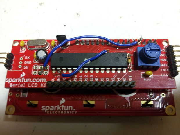 • Soldar un alambre desde el pin de la mitad inferior de la cabecera ICSP sobre con el conector etiquetado "D2" en el conector de pantalla LCD (si está usando el programador ICSP, asegúrese de todavía puede conectar)
